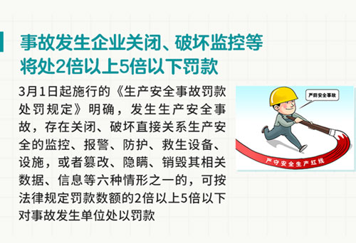 3月1日起施行的《生產(chǎn)安全事故罰款處罰規(guī)定》明確,發(fā)生生產(chǎn)安全事故,存在關(guān)閉、破壞直接關(guān)系生產(chǎn)安全的監(jiān)控、報警、防護、救生設(shè)備、設(shè)施,或者篡改、隱瞞、銷毀其相關(guān)數(shù)據(jù)、信息等六種情形之一的,可按法律規(guī)定罰款數(shù)額的2倍以上5倍以下對事故發(fā)生單位處以罰款...